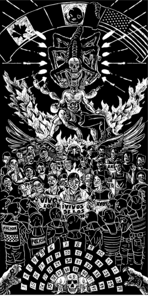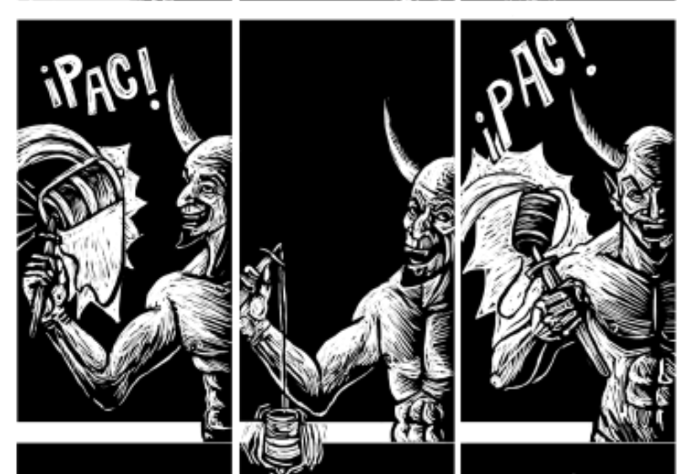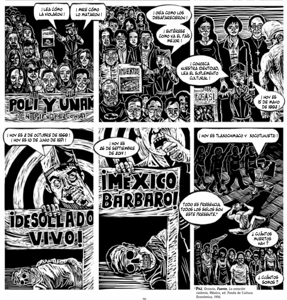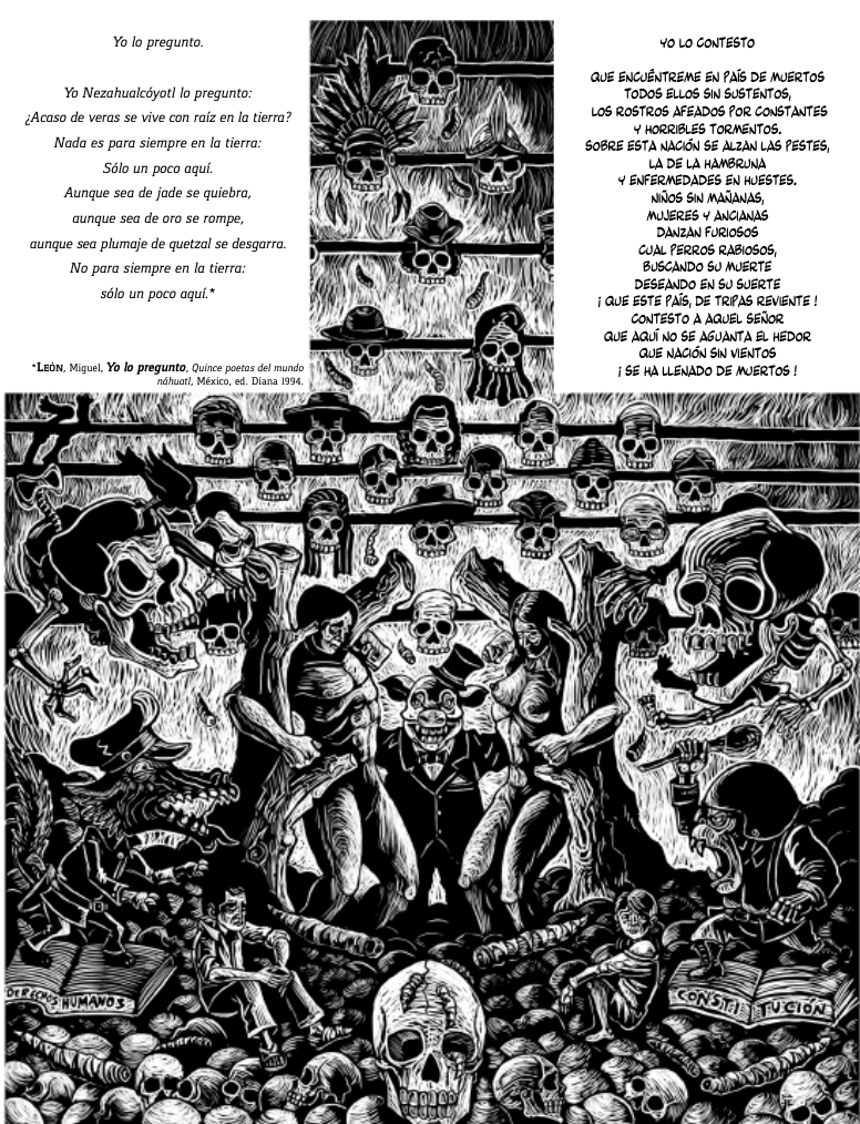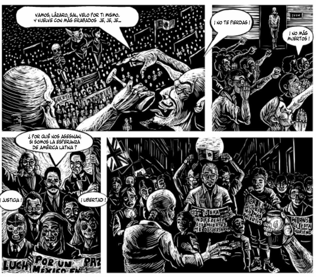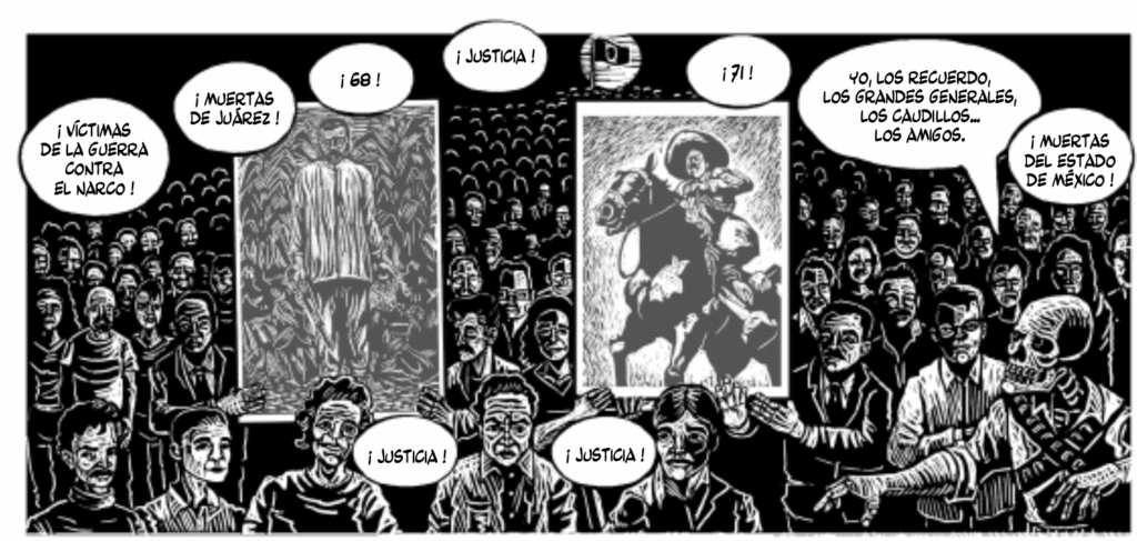 Algo interesante de esta novela gráfica que se presentará mañana domingo 17 de agosto de 2025 a las 13:00 horas en el Museo de la Estampa de la Ciudad de México, es que su discurso de protesta sigue tan vigente como hace 10 años. Pasan los gobiernos, y aunque nos siguen brindando discursos de cuestionable esperanza, la realidad es una creciente ola de delincuencia organizada, violencia extrema, desapariciones, muerte sin piedad y corrupción.